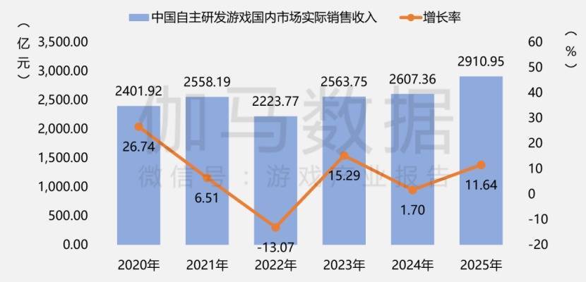 r 2025年,自主研发游戏国内市场实际销售收入2910.95亿元,同比增长11.64%,除得益于头部长青产品稳定支撑外,多款自研新品也带来明显增量;自研游戏海外市场实际销售收入204.55亿美元,同比增长10.23%,规模已连续六年超千亿元人民币。其中,自研移动游戏海外市场实际销售收入184.78亿美元,同比增长13.16%。在全球经济波动、竞争明显加剧背景下,我国游戏企业积极应对,展现出不俗的实力和强劲韧性。