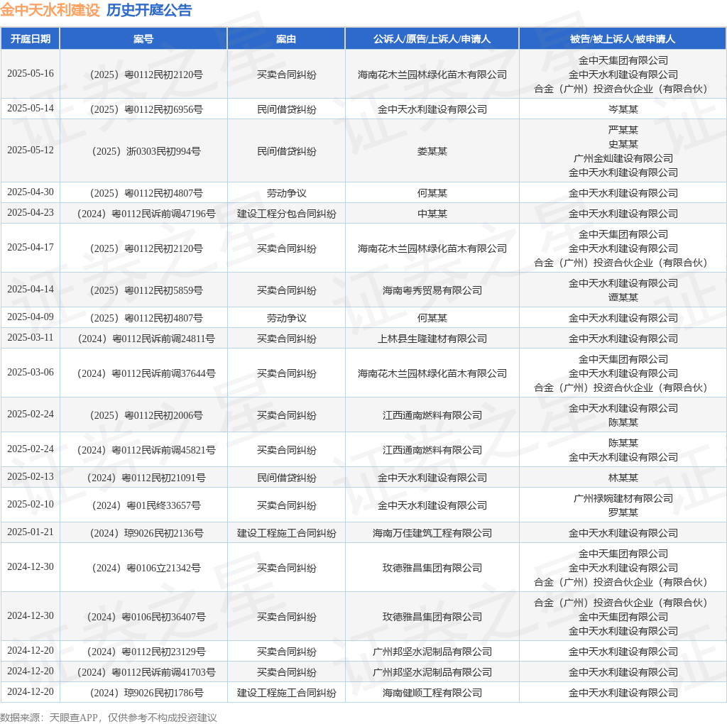 案号:(2025)粤0112民初6956号审理法院:广州市黄埔区人民法院案由:民间借贷纠纷当事人信息: 原告/上诉人:金中天水利建设有限公司 被告/被上诉人:岑某某开庭日期:2025年5月14日根据统计,近一年内以金中天水利建设有限公司为当事人的历史开庭公告有51则,其中案由为“买卖合同纠纷”的公告以25则居首,其次为“民间借贷纠纷”有8则,“建设工程施工合同纠纷”有5则。历史开庭公告(前20条)如下: